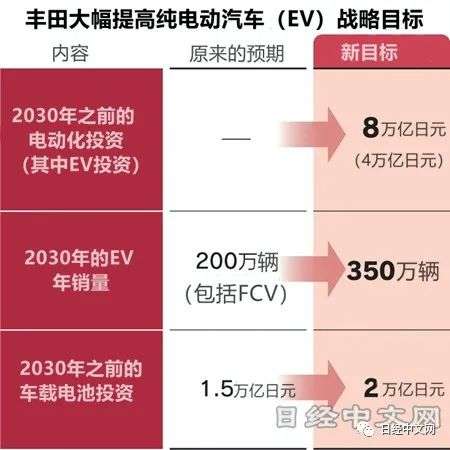丰田转舵?向EV投入4万亿日元 2021-12-22 【导读】丰田12月14日发布了使纯电动汽车(EV)全球销量到2030年增至350万辆这一目标。加上燃料电池车(FCV),比定为200万辆的此前目标增加约8成,大幅提高。丰田还宣布对包括电池在内的纯电动汽车投资4万亿日元。 [详情]