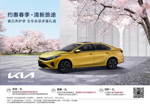 起亚开启2023年春季售后关怀服务活动 2023-04-14 【导读】4月14日,起亚宣布开展以“约惠春季·清新旅途”为主题的2023年春季售后关怀服务活动。4月15日至5月31日期间,起亚车主到店即可享受无忧礼、健康礼、呵护礼三大礼遇,体验到起亚既贴心又周到的服务。 [详情]