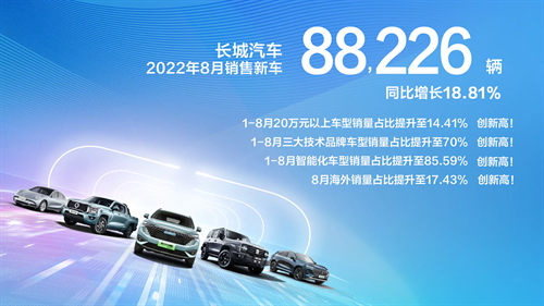 高价值车型占比创历史新高!长城汽车8月销售8.8万辆 同比增长19% 2022-09-13 【导读】9月8日,长城汽车股份有限公司(股票代码:601633.SH,02333.HK;以下简称“长城汽车”)发布2022年8月产销数据。今年8月,长城汽车共销售新车88,226辆,同比增长18.81%。其中,海外销售15,374辆,同比增长2 [详情]