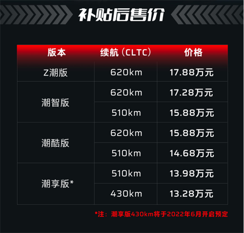 大空间+大续航+大智能!2022款合创Z03正式上市 2022-04-08 【导读】4月9日,2022款合创Z03正式上市,共推出4大版本:Z潮、潮智、潮酷、潮享。除Z潮版外,每个版均有两种续航里程可供选择,补贴后售价区间为13.28万元-17.88万元。 [详情]