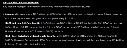 Luminar2021年营收同比暴增129%,净亏损收窄 2022-03-02 【导读】日前,激光雷达公司Luminar发布2021年Q4及全年财报。数据显示,其Q4营收同比暴增408%至1230万美元;全年营收同比增长129%至3200万美元,且完成年度目标。立足2022年,其为自己设立的营收目标位4000万美元。 [详情]