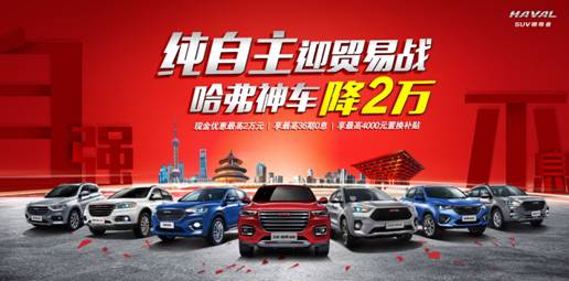纯自主迎贸易战 哈弗神车降2万 2018-09-02 [导读]9月1日,中国SUV 市场再起波澜,SUV领导者哈弗SUV在刚刚结束8月份的“拼团让利”花式营销后,再次宣布:2018年9月1日~10月31日,哈弗将开展“纯自主迎贸易战 哈弗神车降2万”活动 [详情]