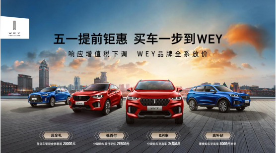 五一提前钜惠 买车一步到WEY——响应增值税下调 WEY品牌全系放价 2019-04-08 【导读】4月,WEY再次推出“五一提前钜惠 买车一步到WEY”活动,为消费者奉上全系车型购车大礼,助力更多用户轻松“拔草”梦想座驾,让更多人能够充分感受到WEY品牌一以贯之的触手可及的豪华。 [详情]