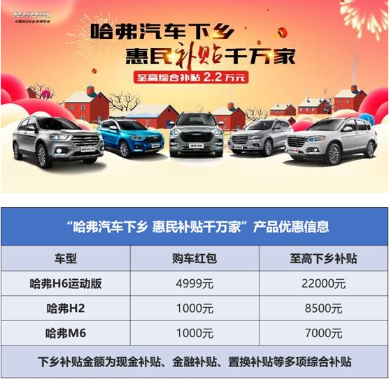 哈弗开启“汽车下乡” 国民神车H6钜惠27000元 2019-02-22 【导读】为更好满足居民出行需要,促进农村汽车更新换代,带动农村汽车消费,哈弗汽车在全国范围内开启“哈弗汽车下乡 惠民补贴千万家”的主题活动。 [详情]