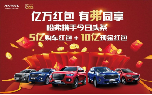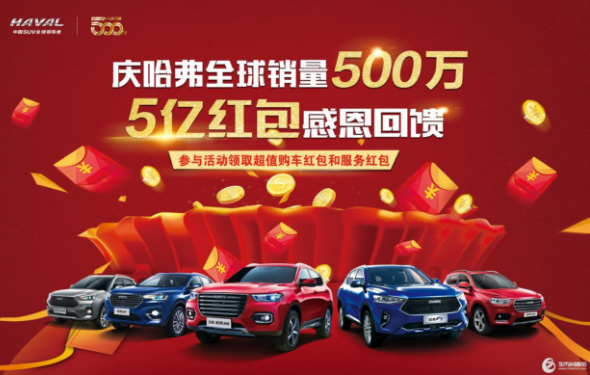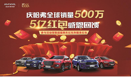 致敬用户 感恩回馈 五亿红包有“弗”同享 2019-01-30 【导读】1月13日,在哈弗技术中心举办了“哈弗全球500万盛典暨全球战略发布会”,会上,主持人李好激情宣布“庆哈弗全球销量500万,5亿红包感恩回馈”活动正式上线。 [详情]