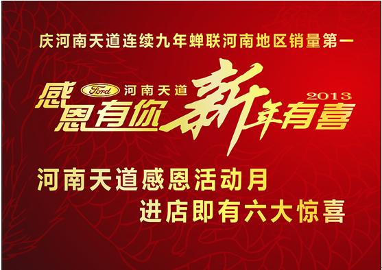 编辑从河南天道福特4S店了解到,为庆祝河南天道连续九年蝉联区域销量第一,特推出“感恩有你,新年有喜”大型主题活动。即日起凡到店客户均有好礼相赠,试乘试驾及分期购车,置换购车均赠送代金券。同时来河南天道保养爱车的客户,也均能享受到以往没有的钜惠。年末正是购车旺季,河南天道推出感恩活动月是为了感谢成立10年来客户对河南天道的支持和信赖。我们将在今后依旧保持“一切以客户为中心”的服务理念,为广大客户带来更舒适的购车环境,更灵活的购车方式,更开心的购车过程。天道服务,更进一步!
