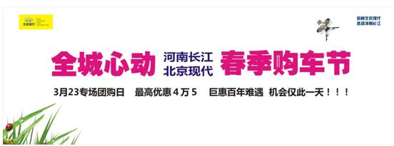 【活动主题】: 全城心动 河南长江北京现代春季购车节 3月23专场团购日 报名即送1000元精品红包