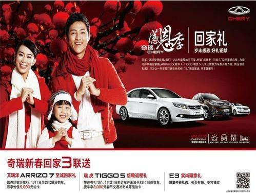 大河车网讯:百达奇瑞在2014年新春佳节即将来临之际,奇瑞“感恩季 回家礼”活动重磅开启,此次活动的主角正是代表了奇瑞全新产品品质形象的“三剑客”车型。具体活动细则如下: