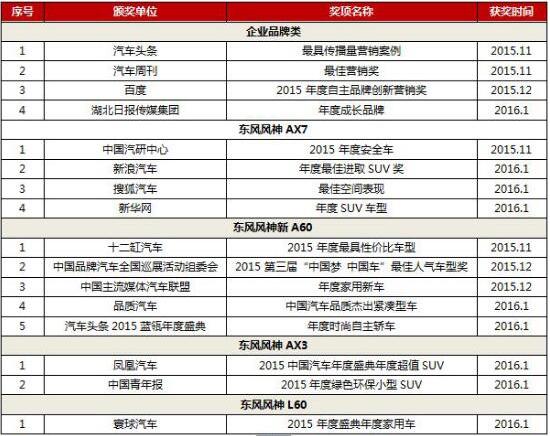 2015年10月底上市的东风风神新A60,以“超高性价比、超低油耗、超大空间、超高颜值”的四超优势,被用户及媒体称为“中国最超值中级车”。在最近两个月中,分别获得2015年度最具性价比车型、2015第三届“中国梦 中国车”最佳人气车型奖、年度家用新车、中国汽车品质杰出紧凑型车、年度时尚自主轿车等五项大奖。
