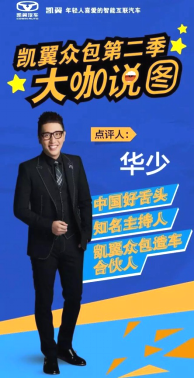 众包大众票选期间,凯翼汽车的第二季表现再次吸引了业内媒体及行业专家的关注,意见领袖倾力加盟,各界大咖齐上阵,通过其在专业领域极具社会公信力与影响力的表现,深入浅出的解读第二季众包优秀作品的精彩亮点,【大咖视点】线上专题上线之后,官微点赞及关注度一路攀升,在大众传播效果的形成过程中将凯翼众包第二季的专业态度,快速、精准、有效的传递受众。包括凯翼众包造车合伙人、中国知名主持人华少,《汽车之友》杂志副社长、中国汽车工程学会科普中心部长高华,汽车通讯社&买车大师创始人唐华等数十位业内媒体及跨界大咖都带来了精彩点评,鼎力助阵凯翼众包造车活动。
