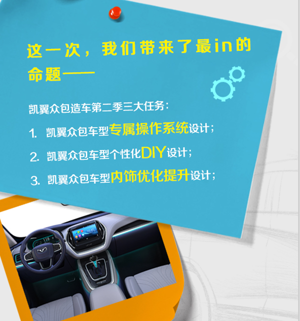 凯翼众包第二季于今年9月2日在成都车展正式启动,在延续第一季“全民造车 人人可参与”核心主旨的基础上再度深化和扩展,更实现了思维的转变。围绕第一季诞生的众包车型,第二季对任务优化升级,更多地从用户群体对汽车产品的需求出发,共发布三大全新任务:凯翼众包车型专属操作系统设计、凯翼众包车型内饰优化提升设计及凯翼众包车型个性化DIY设计。命题具备广度的同时,更体现企业对于触及消费者心理诉求、挖掘用户深层次消费价值的用心。三大任务涵盖车辆外观、内饰、操作系统等各个方面,旨在吸引社会各界汽车爱好者都能参与到造车运动中来,给汽车设计带来颠覆传统思维的全新思路和想法,打造更受“年轻人喜爱的智能互联汽车”。