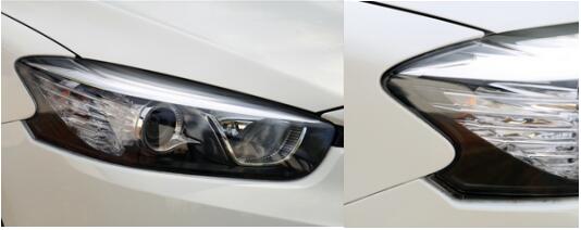 左右延展的长条式大灯形状不太规则,与车头的融合性较好,外侧的曲线对工艺要求比较高,细节做工在同级别中表现比较到位。最内侧为远光灯,中间是带有透镜的近光灯,外侧则为转向灯。LED日间行车灯与雾灯安排在了一起,视觉效果同样协调,雾灯为全系标配,而LED日间行车灯则配置与豪华型以上车款。