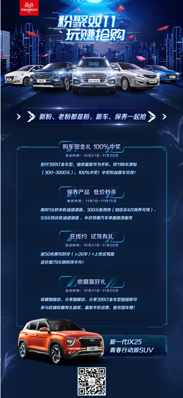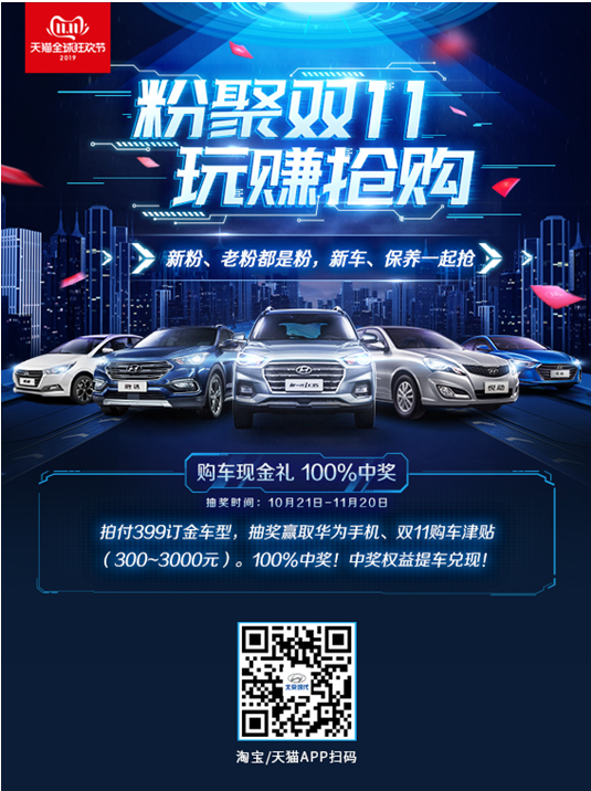 双11近在咫尺,你的购物车装满了吗!快上淘宝体验北京现代与天猫共同打造的购车服务模式吧,轻松买车还有好礼相送,这个双11乐享不停!