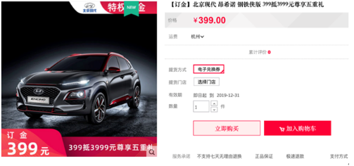 一年一度的“双11”全民狂欢购物节已进入倒计时,各种类型的品牌都争相亮相此次购物大节。除了以前我们司空见惯的3c、美妆、电器等产品,现在许多汽车厂商也开始征战淘宝电商这个大平台,北京现代也不例外。今年,北京现代推出了史无前例的“购车狂欢,现金抵扣”活动,只要在11月20日前拍付399元活动车型,即可参与店铺抽奖活动,更有机会赢取华为手机、双11购物津贴。