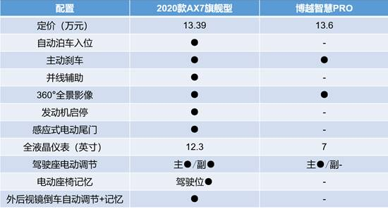 相比2020款AX7在配置上做加法的用心,博越智慧PRO在脚踢感应式电动尾门、外后视镜电动折叠、自动泊车、下雨自动关闭天窗等配置方面的缺失,着实让性价比大打折扣。而且在一些关键性配置对比中可以发现,2020款AX7在EPB电子驻车制动系统+Auto-Hold自动驻车系统、FCW前碰撞预警系统、AEB刹车辅助系统、BSD盲点监测系统等高端配置价格门槛更低,对于消费者来说更加实惠。