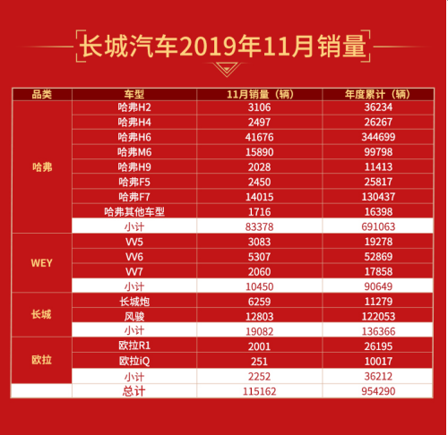 12月9日,长城汽车发布2019年11月销量数据。今年11月,长城汽车销量稳中有进,销售新车115162辆,环比增长0.13%,其中哈弗、WEY、欧拉和长城皮卡分别销售83378辆、10450辆、2252辆和19062辆。1-11月,长城汽车累计销售新车达954290辆,同比增长3.81%,2019年销量目标已达成89.2%,完成全年销量目标指日可待。