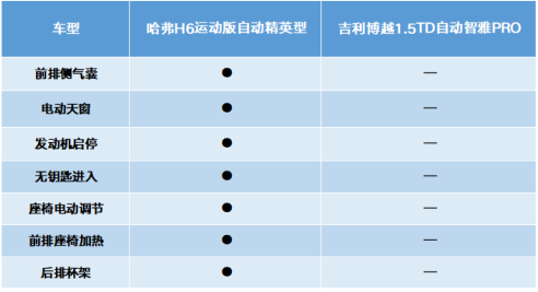 说起中国汽车品牌,丰富的功能配置绝对是一大亮点,但是博越PRO和哈弗H6运动版相比,还是差了点意思,特别是前排侧气囊的缺失,让消费者对其安全能力有很大忧虑。此外,哈弗H6运动版还拥有国人最喜爱的的全景天窗配置。