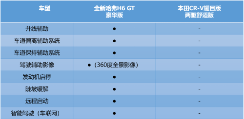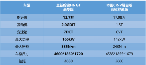 工欲善其事必先利其器,哈弗H6良好的市场表现离不开强劲的产品实力,这也正是其面对合资车型围剿能够脱颖而出的关键,为了清晰明了的展现产品实力,我们将通过全新哈弗H6 GT豪华版和本田CR-V耀目版两驱舒适版(以下简称C-RV)进行对比,尽可能全面的展现哈弗H6是如何对合资车型实现超越的。