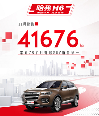 在11月销量中,哈弗品牌单月销量达到83378辆,而明星爆款车型——哈弗H6的成绩更是亮眼,41676辆的傲人数据使其再夺SUV销量冠军,并实现累计78个月称霸市场的壮举。同时哈弗H6也是11月唯一销量破4万的SUV车型,被称为车界“最强爆款”也绝不为过。