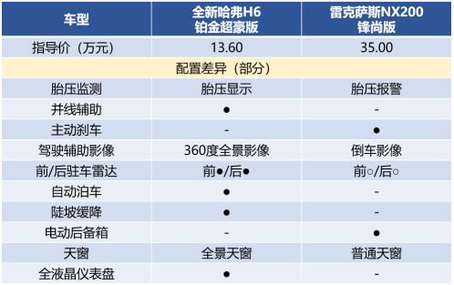 以驻车雷达和倒车影像为例,这两项配置实用性很高,也是很多用户的刚需。全新哈弗H6铂金版拥有前/后驻车雷达和高清360度全景影像,几乎武装到了顶端。而雷克萨斯NX200只有普通的倒车影像,驻车雷达还得选配,试问如何体现“豪华”二字?