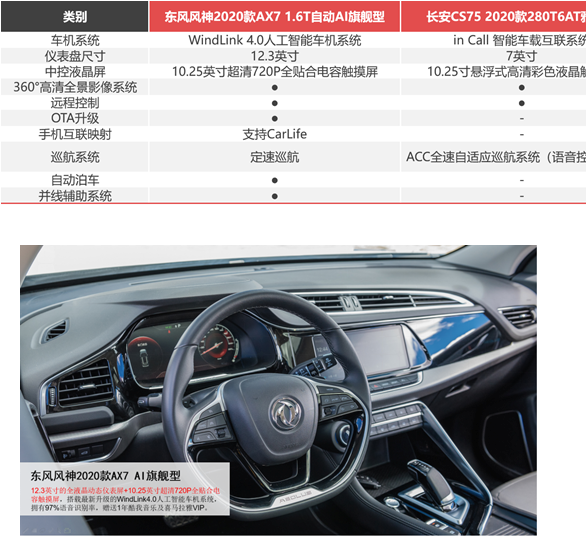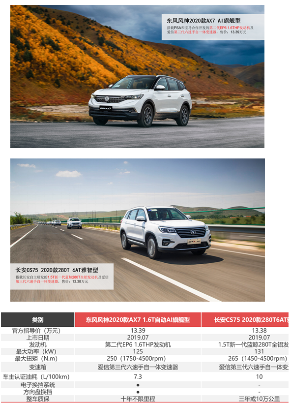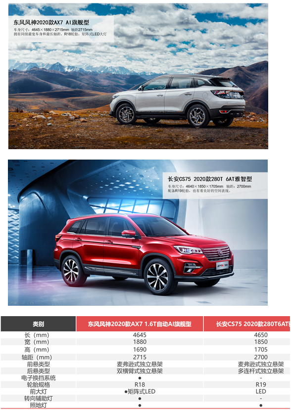 这两款产品均具有军工背景,在市场上的口碑都相当不错。我们选取价格相同的东风风神2020款AX7 1.6T自动AI旗舰型(13.39万元,简称2020款AX7)与长安CS75 2020款280T 6AT雅智型(13.38万元,简称2020款CS75)进行对比,看看它们的实力到底如何,到底哪一款才是年轻人的菜?
