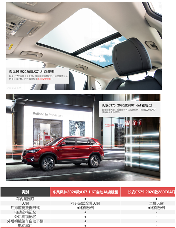 选择一辆车,在动力参数、车身尺寸既定的情况下,更丰富、实用的配置就成了加分项。全景天窗,已经成为自主品牌的必答题,在2020款AX7和2020款CS75上必须配置到位,不过2020款AX7的全景天窗达1.17平方米,更通透、宽阔。