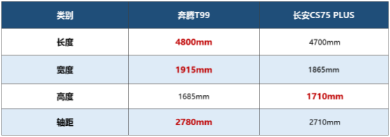 在车身尺寸方面,奔腾T99在车身长度、宽度、轴距方面均明显优于长安CS75 PLUS,车身高度略逊一筹。