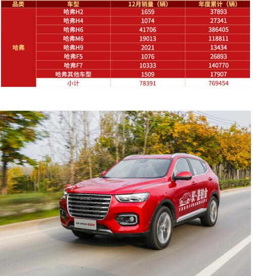 2019年12月,哈弗品牌销量达到78391辆,高居中国SUV月度销量榜首。同时,哈弗品牌全年累计销售共769454辆,再度斩获中国SUV年度销量冠军,这也是哈弗品牌第10年蝉联此奖项。在风云变幻的车市之中,哈弗品牌带领中国品牌抵御合资冲击,积极向上,尽显冠军风姿。
