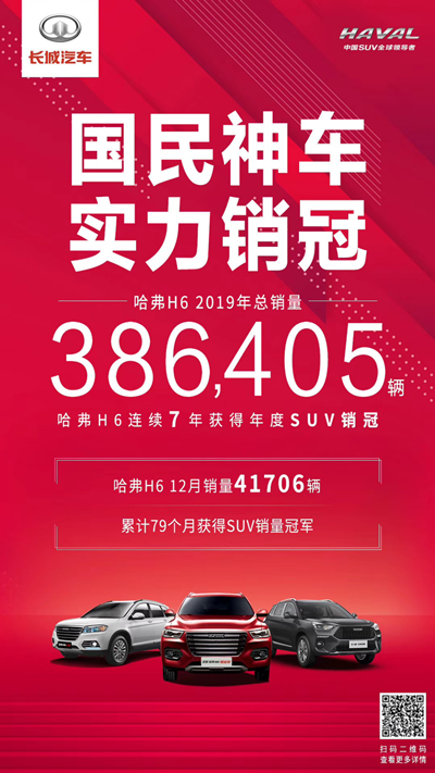 作为家喻户晓的国民神车,哈弗H6在2019年12月份共销售41706辆,已累计79次获得中国SUV月度销量冠军,进一步拉大竞争优势。同时,哈弗H6又以386405辆的全年销售成绩,稳居中国SUV车型年度销量榜首,连续7年蝉联中国年度SUV销冠。