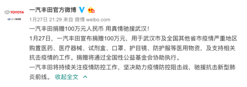 1月27日,一汽丰田正式宣布:即日起捐赠100万元,用于支持抗击武汉市及全国其他省市新型冠状病毒肺炎疫情的工作。