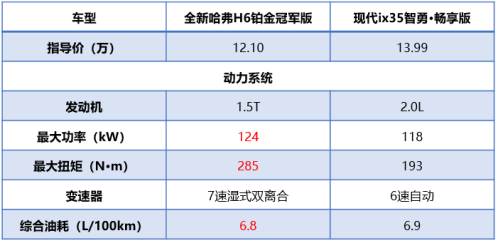 究其原因也不难理解,因为全新哈弗H6铂金冠军版的1.5T发动机是目前哈弗的王牌产品,拥有行业领先的CVVL连续可变气门升程技术、双VVT等多项高科技,具有国际一线实力。而现代ix35这款发动机,还是几年前的产品,整体技术是较为落后的,也可以说是一款濒临淘汰的产品,因此相比于哈弗1.5T发动机不占优势。