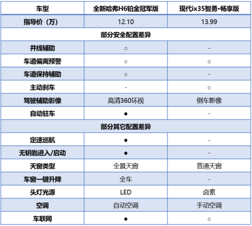 我们选择指导价12.10万元的全新哈弗H6铂金冠军版,对比指导价13.99万元的现代ix35智勇·畅享版,二者价格相差不到2万,也都同属于紧凑级SUV,进行PK也算公平。