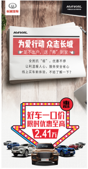 当然,在哈弗品牌稳健的销量表现背后,其不断完善、不断进步的服务体验同样居功至伟。在此次抗击疫情的关键阶段,哈弗品牌母公司长城汽车前后5轮累计捐款及车辆价值已达885万元。同时,哈弗还推出“三减三赋”优惠政策,及“无忧用车五大保障”和“五心关爱行动”,与经销商合作伙伴及哈弗车主共度难关。而为了响应国家号召,哈弗还开启线上购车、网络直销会等活动,以“零接触、一口价卖车”等举措为消费者提供更安全、更便捷、更优惠的消费方式,积极抗击疫情。