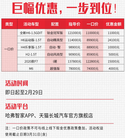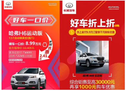 而在汽车之家、苏宁以及易车哈弗旗舰店等平台,哈弗则奉上好车一口价、好车折上折等玩法多样、优惠多多的购车活动,至高钜惠可达到30000元,同时只需支付9.9元定金,既可额外享受1000元限时购车优惠。