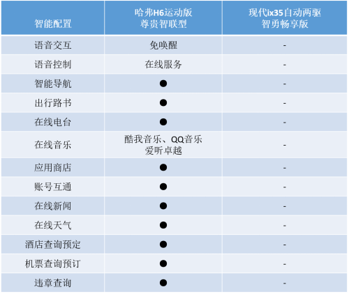 正可谓“一叶落知天下秋”,空间方面的卓越表现只是哈弗H6运动版强悍实力的优势之一,在智能配置方面,哈弗H6运动版同样拥有远超同级车型的表现。我们可简单通过对比售价较为接近的哈弗H6运动版尊贵智联型、北京现代ix35智勇畅享版,更加清晰的发掘两款车在智能配置等方面的表现。