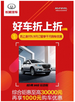 同样以哈弗H6运动版为例,在线上购车活动中可享受24100元的限时购车优惠,只需首付4495元,48期月供2245元,便可凭89900元的超低价入手哈弗H6运动版自动精英型。而在汽车之家、苏宁以及易车哈弗旗舰店等平台,购买哈弗H6运动版可享受“好车折上折”等玩法多样、优惠多多的购车活动,至高钜惠可达到30000元,并且只需支付9.9元定金,既可额外享受1000元限时购车优惠,有效解决消费者购车的需求。