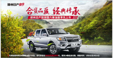 3月6日,郑州日产锐骐柴油国六车型正式开启预售,凡预售期间预定锐骐柴油国六车型,即可享受交1000元抵2000元,更享24期低息优惠。活动周期为3月6日至3月16日。
