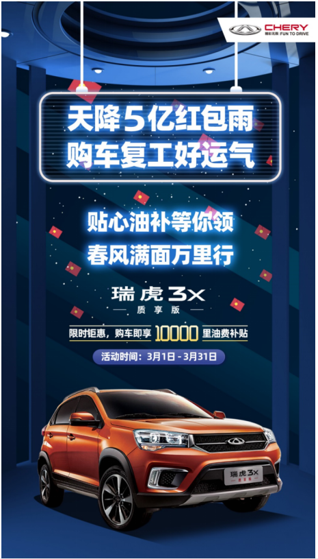 如果车型的性价比让你心生欢喜,那么奇瑞汽车最新钜惠“天降5亿红包雨”就更不容错过!从3月1日起,购全新一代瑞虎8、瑞虎5x HERO、瑞虎3x质享版、艾瑞泽GX冠军版、艾瑞泽GX PRO、艾瑞泽5 PRO在内的奇瑞全系车型,可享受高额优惠。其中瑞虎3x质享版给广大青年带来实惠满满的购车福利:购车即补贴10000里油费,相当于“买车包油”哦,入门神车等你来拿!