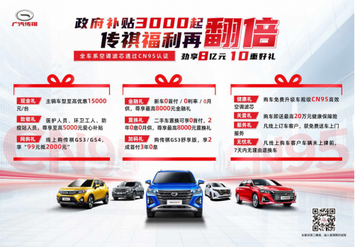 对此,广汽传祺积极响应政府的强力支持,重磅推出“暖春购车季,劲享十重礼”活动,不仅有全车系8亿元健康关爱补贴,更有十重好礼回馈消费者。