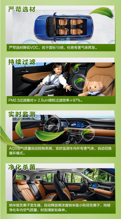 广汽传祺本次通过认证的空调滤芯技术,使用高效低阻熔喷复合技术生产,具备更高效过滤能力,三重过滤技术,可有效隔绝空气有害物质,对0.3μm的微粒过滤效率≥95%,对多种病菌的杀菌率在99%以上,为车内乘客带来纯净健康的空气。