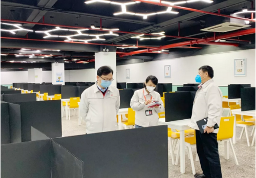 餐厅是人员密度大且需要摘掉口罩吃饭的地方,所以必须加大对于餐厅的安全管理。为了保证安全用餐,公司延长用餐时间,采用分时用餐的方式控制餐厅人员密度;同时采用物理隔离的方法将餐桌隔离出一个个小格子,避免人员直接接触;就餐可以在餐厅也可以以网格为单位打包带回办公室,可以进一步减少员工的走动和接触机会,并且餐厅消毒更是按照最高消毒标准执行。