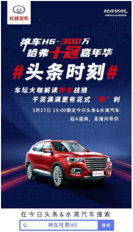 经过了解,原来是哈弗品牌为庆祝旗下神车哈弗H6全球销量突破300万辆、为回馈全球用户,特推出的“神车H6 300万 哈弗十冠嘉年华”直播盛典月活动。六大惊喜十重礼遇福利丰厚,据悉活动将于3月27日在今日头条&水滴汽车中的直播作为起点,并带领用户向“弗”礼发起总攻!