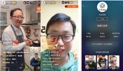 事实上,在东风风神大区的组织下,武汉地区多家经销商早在2月,就已经为线上“营业”做好了准备,依托快手、抖音等热门平台,实施全员注册、全员培训后,在2月下旬就已经通过全员直播的方式在线“练兵”。
