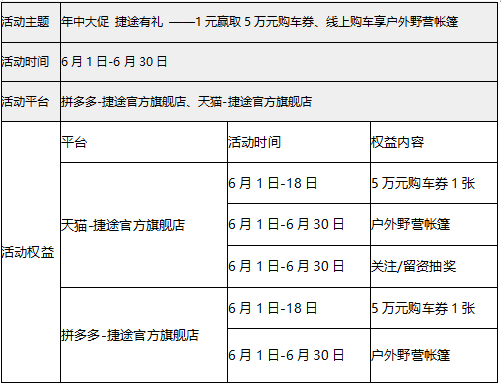 除此之外,用户只需登陆拼多多、天猫线上订车平台,即有机会获得1元赢取5万元购车券,同时线上购车还可享受户外野营帐篷。满足大家足不出户,就能看车选车购车的需求,大大提升了购车的效率和体验。
