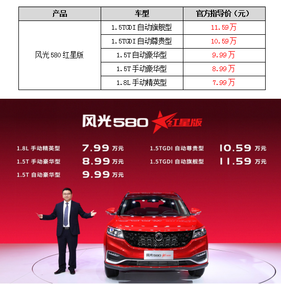 风光580一直以来领衔着东风风光,而且它还一直是国产SUV品牌中的亮眼红星。可以说,自从风光580上市以来,它就受到了车主用户的一致好评,此前的好评基础,使得风光580红星版的出现那么顺理成章。此次风光580红星版的亮相,重新刷新人们对高品质汽车生活的认识,再度突破性价比新高,让人亲切感受到风光580的诚意。