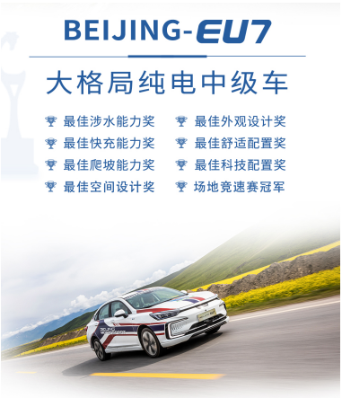 BEIJING-EU7第二次参加环青赛,其高性能永磁同步电机最大输出功率达160kW,最大扭矩300N·m,动力性能媲美2.0T燃油发动机,在爬坡、涉水等性能评测项目中表现优异;同时凭借着2785mm长轴距带来的超大空间,以及对标豪华车型的设计和做工,在外观、内饰、舒适性等主观评测项目中取得高分。