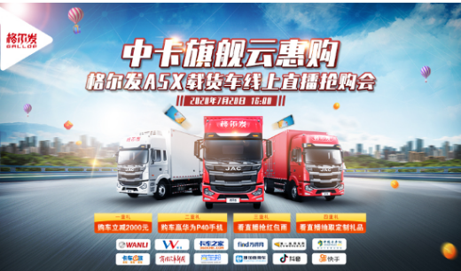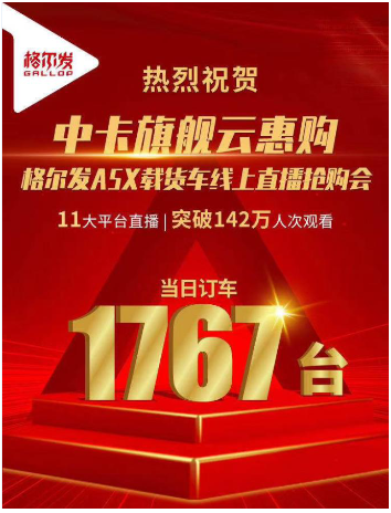 2020年7月28日,以“中卡旗舰 云惠购”为主题的江淮格尔发A5X载货车线上直播抢购会全网多平台同步直播圆满收官,行业十大媒体同步转播,142万名商用车用户线上观看直播,共同见证格尔发中卡旗舰全新升级发布。直播1小时期间,江淮格尔发携多重好礼回馈格尔发新老用户,以现场斩获1767台的订单掀起中卡用户的抢购热潮。