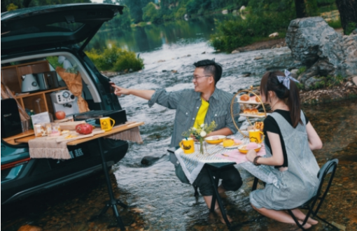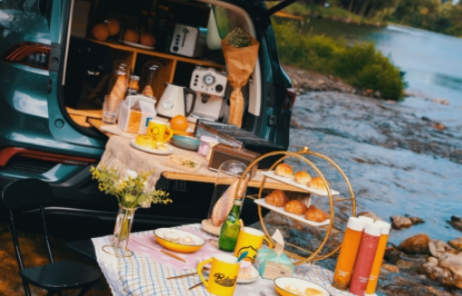 玩累了,野餐走起。男友和他好哥们准备得非常充分,面包、苏打水、水果、果饮等好吃的东西满满当当摆了一桌子,还有一顶帐篷。这么多东西,也真得亏了大豪越能装下。