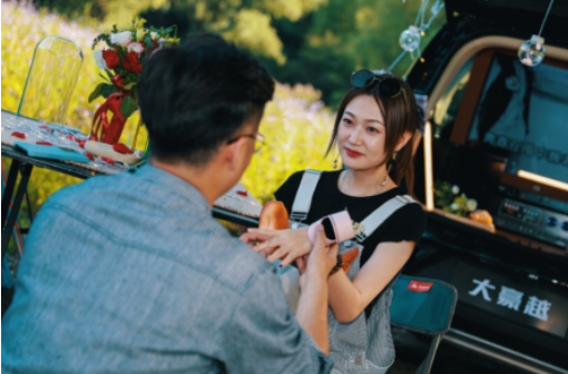 溪水很是清凉,但不能长待,还是上岸吧。男友又从另一辆豪越上变戏法似的取出一套音响K歌装备,男友唱歌很好听,像张学友。吃瓜群众的我正坐在一边听他唱歌,等着吃烧烤呢,谁知道他突然单膝跪地,拿起一束花递给我,充满深情地说:“亲爱的,嫁给我,好吗?”