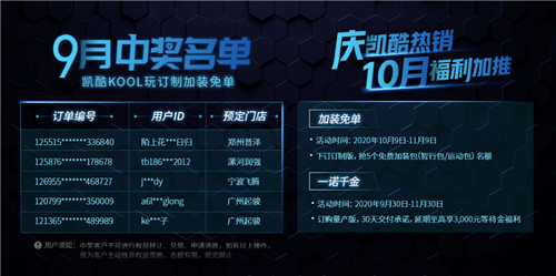 获奖名单来了,快来看看有没有你!自上市以来,K5凯酷以一款真正的全球车实力和极具差异化的超值服务,成为年轻人的“心头好”,并在沉闷已久的B级车市场掀起供不应求、上市即热销的抢购热潮。近日,K5凯酷为9月份订购KOOL玩订制款车型的用户抽取加装免单礼,首期获奖名单已出炉,5位幸运车主获得价值3000元的“免费加装包”惊喜。